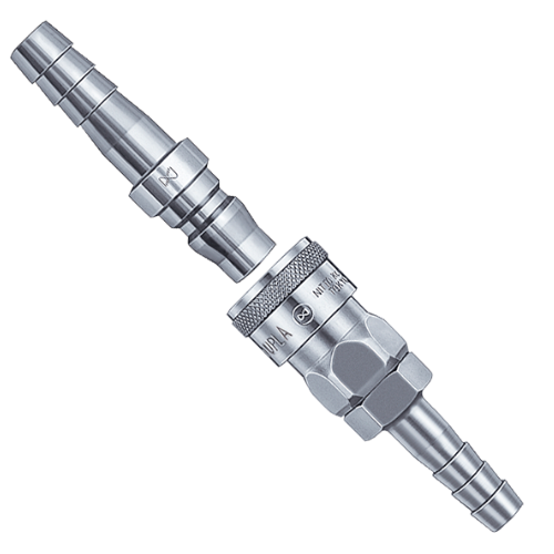 有優(yōu)越通用性的快速接頭,可用于從工廠的空氣配管到空氣工具的軟管 連接的各類用途。 ●鋼鐵材質(zhì)適用于空氣,黃銅、不銹鋼材質(zhì)適用于水。 但是,分離時流體從插塞一側(cè)流出來,敬請注意。 鋼鐵材質(zhì)的重要構(gòu)成部件經(jīng)過熱處理增加了強度。有良好的耐磨損性和耐久性。 ●主體材質(zhì)與尺寸種類豐富,安裝形狀標準化,可用于廣泛的空壓用途。